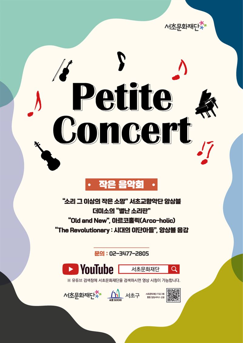 지난 2021년에 진행한 <Petite Concert>는 사전 공모를 통해 재즈, 국악 장르의 퓨전음악 공연팀 3팀을 선정하여 청년예술가들에게 공연 기회를 제공했다. 올해 4월까지 진행되는 <Petite Concert>는 서초문화재단 상주예술단 서초교향악단 앙상블과 서리풀청년문화기획단이 함께 클래식, 국악, 크로스오버의 다양한 장르의 공연으로 관객들과 만난다.