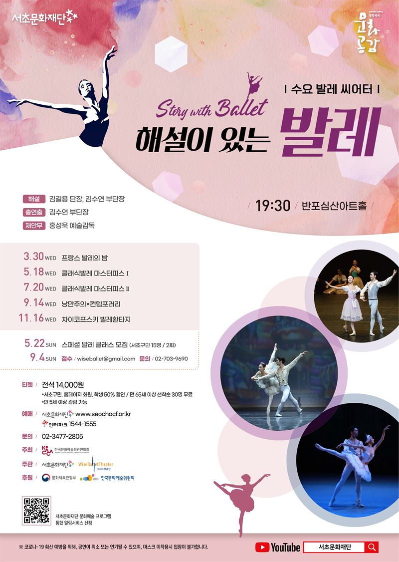 한편 한국문화예술회관연합회가 주최하고 문화체육관광부와 한국문화예술위원회가 후원하는 2022 방방곡곡 문화공감 지원사업 <해설이 있는 발레 “Story with Ballet”>는 전석 1만 4천원으로 코로나19 확산 예방을 위한 객석 간 거리두기로 진행된다. (재)서초문화재단은 코로나19로 인해 오프라인 공연 및 온라인 유튜브 영상 콘텐츠 제공의 투트랙(2-Track)으로 관객들과 만나게 된다. 자세한 사항은 서초문화재단 홈페이지를 통해 확인이 가능하다.