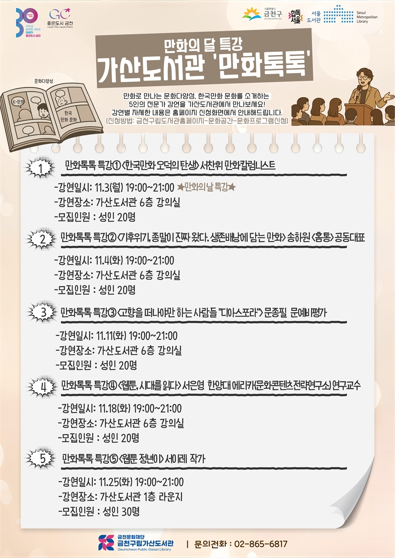 11월 3일부터 매주 저녁 7시마다 가산도서관 6층에서 만화 관련 전문가 강연과 참여형 토크가 펼쳐질 예정이다.
