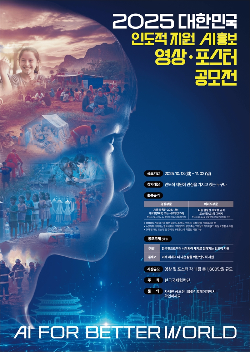 코이카(KOICA·한국국제협력단)는 11월 2일(일)까지 ‘인도적 지원’을 주제로 ‘AI FOR BETTER WORLD : 2025 대한민국 인도적 지원 AI 홍보 영상·포스터 공모전’을 개최한다. 이번 공모전은 생성형 AI 기술을 활용해 전 세계 위기 극복을 위해 추진하는 대한민국 인도적 지원의 의미와 가치를 알릴 창의적인 아이디어를 모집하기 위해 마련됐다.