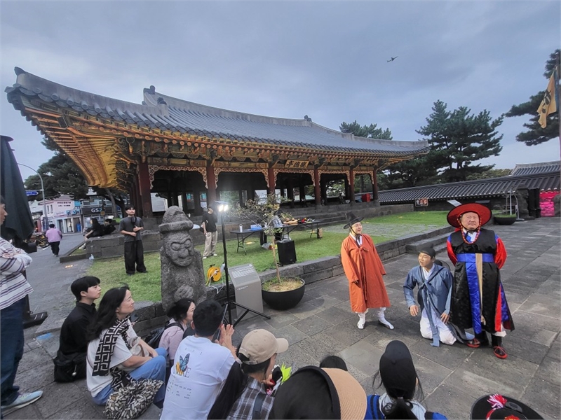 주말도 아닌 주중에 진행된 투어 콘텐츠임에도 사전 신청 참여율 90%를 기록한 ‘저승차사와 원도심 유산투어’는 제주 설화 강림차사의 이야기를 따라 △제주목 관아 △서자복 △용연 △제주성 △오현단 △귤림서원 등 제주 원도심의 제주국가유산 6곳에서 진행됐으며, 배우 6명과 관객 30여 명이 제주 신화 ‘강림차사’ 스토리로 재구성된 투어 연극에 참여했다.