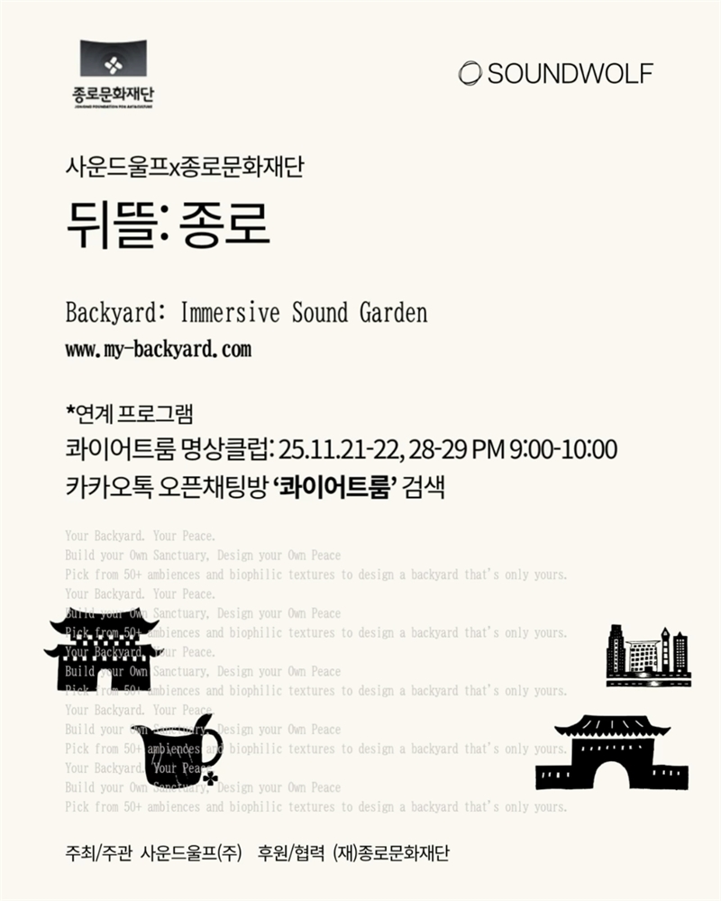사운드 아트 기업 사운드울프(대표 박소현)가 종로문화재단과 협력해 서울 종로구의 장소성과 기억을 소리로 재해석한 이머시브 사운드 웰니스 프로젝트 ‘종로: 뒤뜰(Backyard: Jongno)’을 11월 21일 공개했다. 도시의 풍경을 청각적 경험으로 전환해 개인의 휴식과 감각 회복을 제안하는 지역 기반 사운드 실험이다.