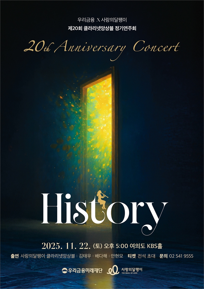청각장애인을 지원하는 사단법인 사랑의달팽이(회장 이행희)가 우리금융그룹 우리금융미래재단과 함께 오는 11월 22일 서울 여의도 KBS홀에서 ‘우리금융X사랑의달팽이 제20회 클라리넷앙상블 정기연주회’를 연다.올해로 20회를 맞는 이번 연주회는 ‘히스토리(History)’를 주제로 지난 20여 년을 대표하는 곡들을 선별해 구