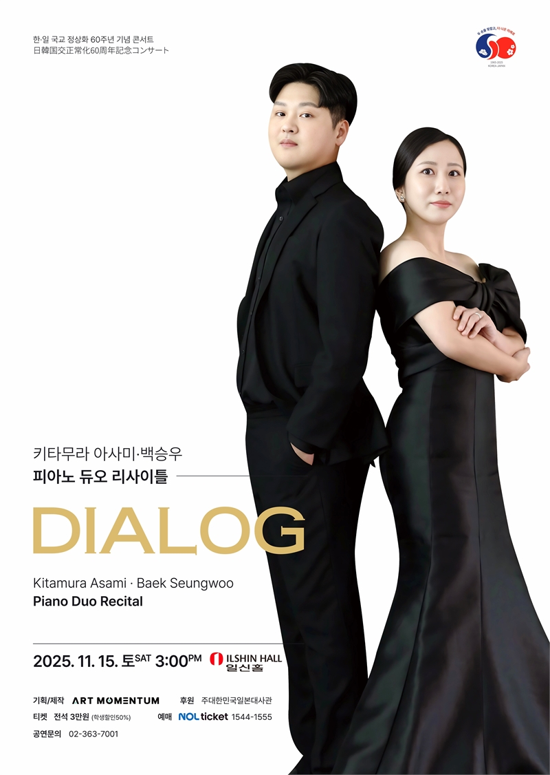 한일 국교정상화 60주년을 기념하는 듀오 리사이틀 ‘Dialog’가 오는 11월 15일(토) 오후 3시 서울 일신홀에서 열린다. 이번 공연에서는 일본 피아니스트 키타무라 아사미와 한국 피아니스트 백승우가 처음으로 함께 무대에 올라 특별한 음악적 순간을 선사한다.이번 리사이틀은 두 아티스트가 하나의 피아노 앞에서 호흡을 맞