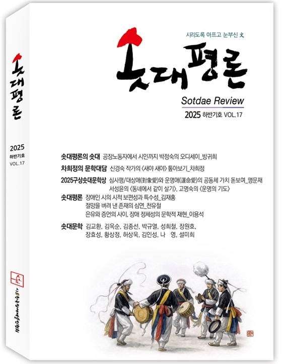 한국장애예술인협회(석창우 회장)에서 ‘솟대평론’ 17호를 발간했다. 올 하반기호로 2025년 구상솟대문학상 공동 수상자인 서성윤, 고명숙 시인 삶과 작품 세계 그리고 대표작이 소개돼 읽을거리가 풍성하다.서성윤 시인은 스무 살 교통사고로 전신마비 장애를 갖게 된 후 “온몸으로 쓴 글쓰기가 시가 됐다. 자유롭게 흐르는 언어로