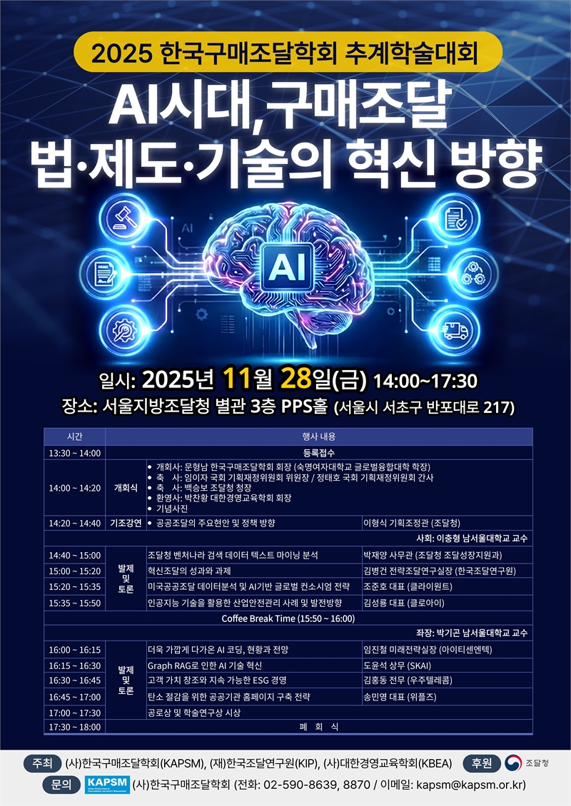 한국구매조달학회(회장 문형남, 숙명여자대학교 글로벌융합대학 학장)는 대한경영교육학회(회장 박찬황), 한국조달연구원(원장 이상윤)과 함께 오는 11월 28일(금) 서울지방조달청 별관 3층 PPS홀에서 ‘AI 시대, 구매조달 법·제도·기술의 혁신 방향’을 주제로 2025 추계학술대회를 개최한다.이번 학술대회는 국회와 조달청,