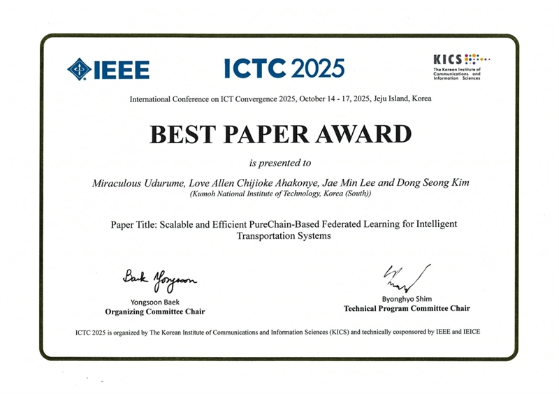 국립금오공과대학교 김동성 교수 연구팀, ICTC2025 우수논문상 수상