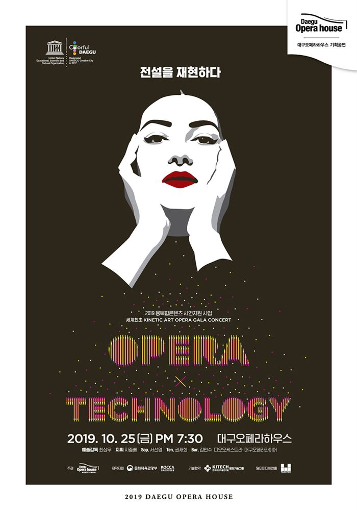 대구오페라하우스(대표 배선주)가 오는 10월 25일(금) 오후 7시30분 오페라 갈라콘서트 <전설을 재현하다>를 통해 새로운 예술적 시도로 관객과 소통하는 특별한 경험을 준비하고 있다. 한국콘텐츠진흥원의 '2019 융복합 콘텐츠 시연 지원사업'으로 선정된 이번 공연은 대구오페라하우스의 주관 아래, 한국생산기술연구원 문화기술(CT)그룹과의 기술협약, 평창 문화올림픽 주제공연과 BTS월드투어의 무대미술을 담당해 온 ㈜유잠스튜디오와의 공동작업으로 새롭게 시도되는 '융복합 오페라 갈라콘서트'이다.