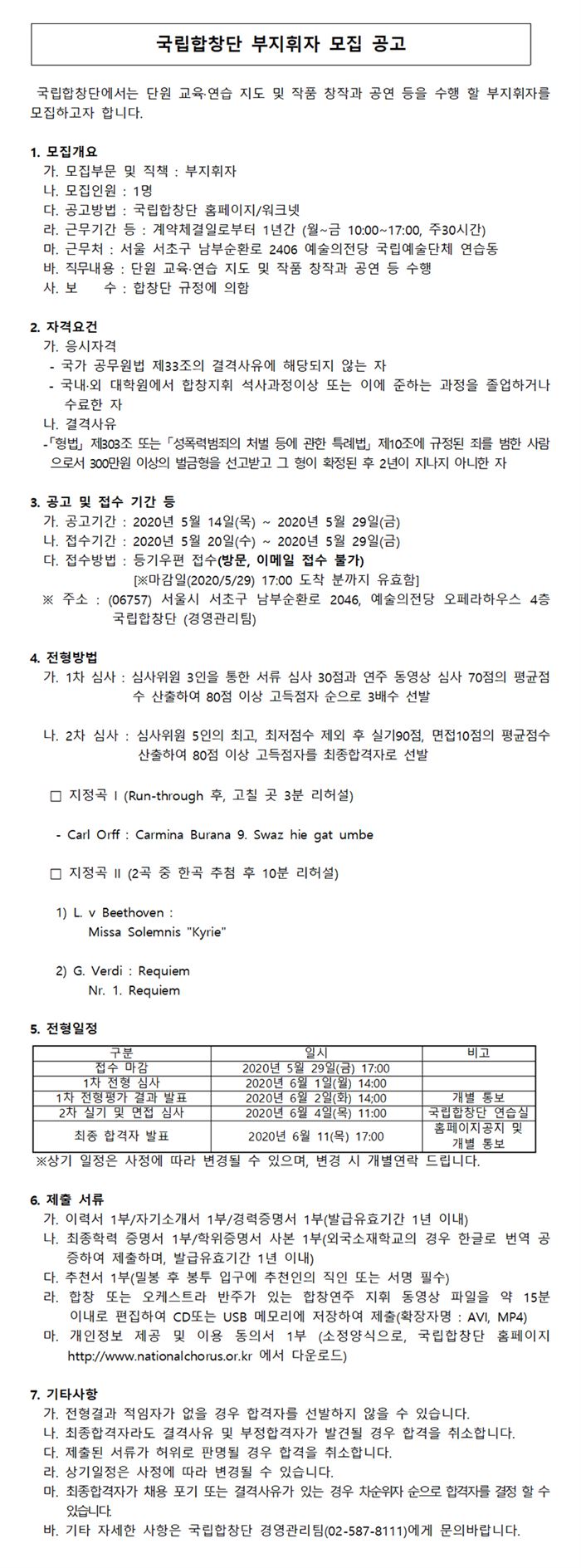 한편 이번 채용 공고에 관한 더욱 자세한 정보는 국립합창단 홈페이지에서 확인할 수 있으며, 아래는 국립합창단이 공개한 이번 부지휘자 모집 공고문의 전문이다.