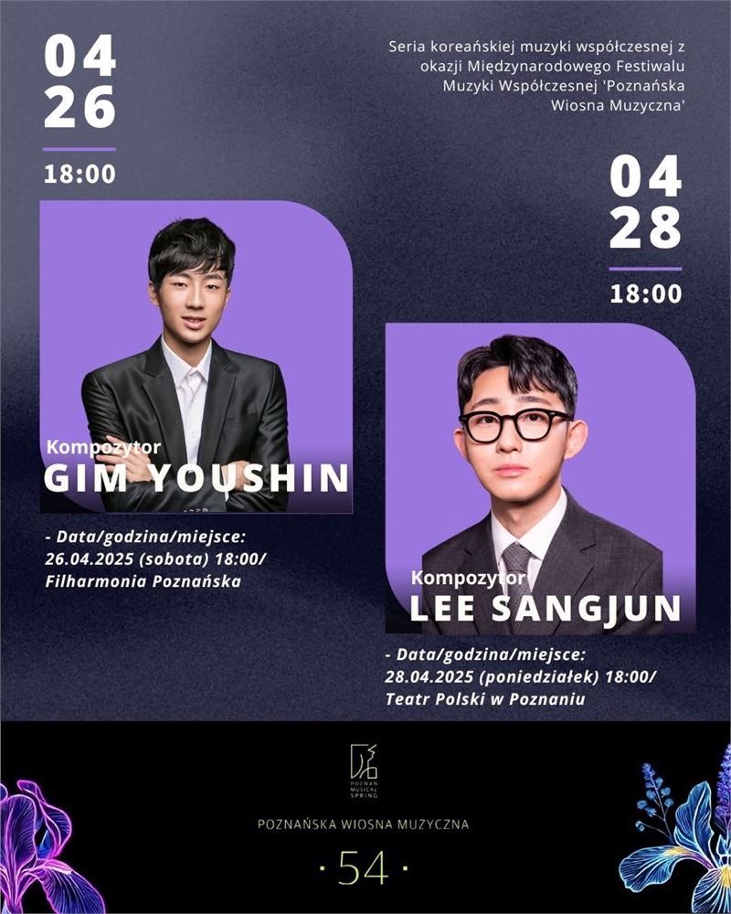 주폴란드한국문화원 이당권 원장은 “두 젊은 작곡가는 유럽 음악 무대에서 예술성과 창의성을 인정받으며 활발히 활동을 이어가고 있는 예술가들로, 이번 초청은 한국 현대음악의 현재와 미래를 보여주는 계기가 될 것”이라고 밝혔다.
